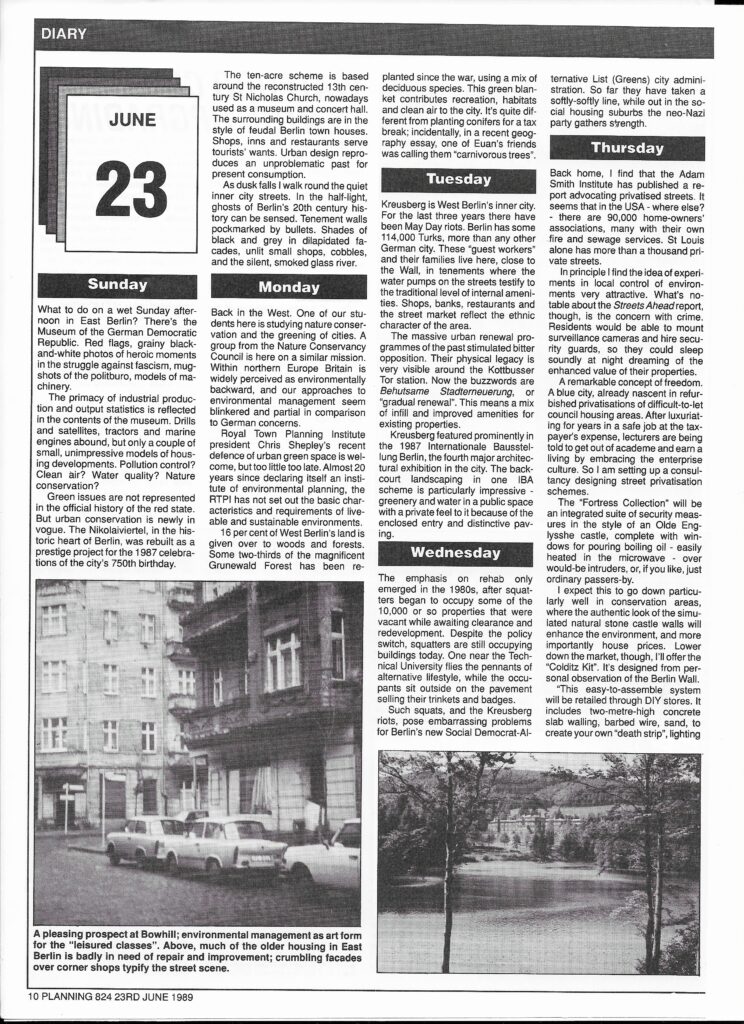 A chance to read my monthly Diary in Planning from June 1989, which starts in Berlin just months before the Berlin Wall came down. It also looks at the Adam Smith Institute’s ideas for privatising streets – an idea that might be revived post-Covid19? Of course there have been many gated communities developed in the meantime.